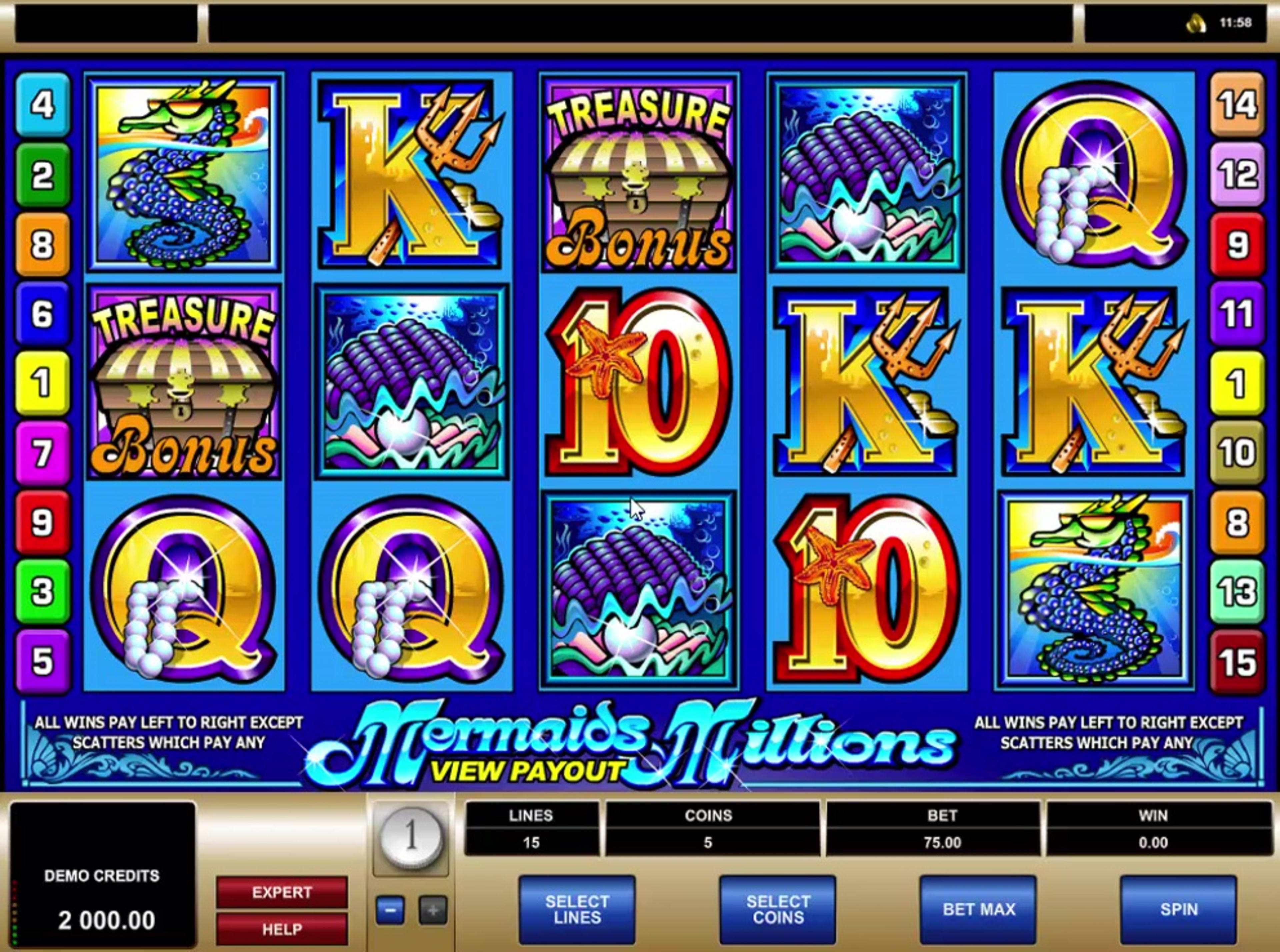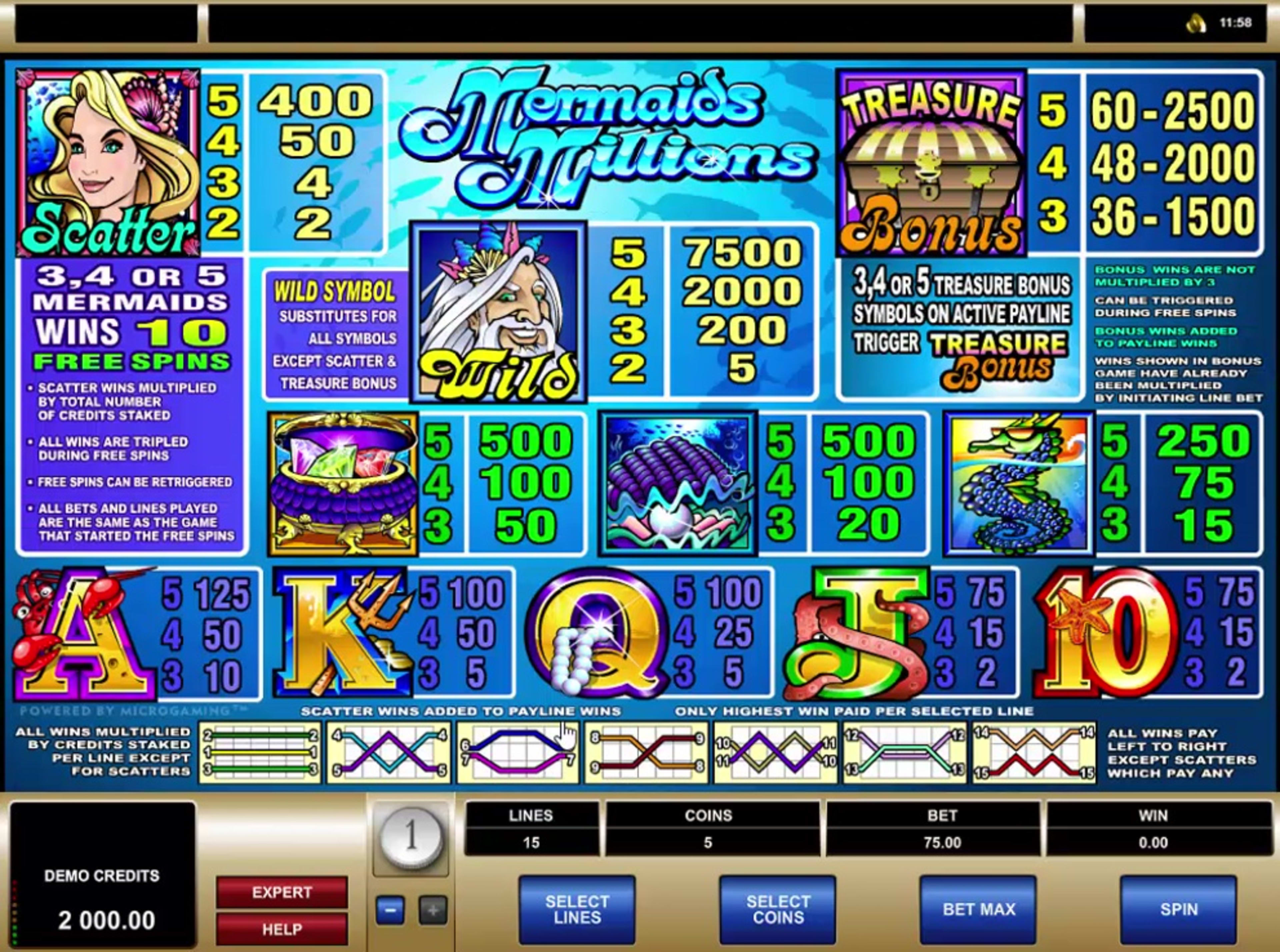 Mermaid's Millions har ett enkelt tema som kretsar kring havet och dess mytiska varelser. Det finns sjöjungfrur i spelet, uppenbarligen, tillsammans med Poseidon, med skattkistor, pärlor och smyckeskrin fyllda med ädelstenar. Det är också en av de äldre titlar som finns tillgängliga från Microgaming, så jag tvivlar på att många kommer att hitta dess design väldigt attraktiv. Även om det ser ut som den typ av spel med färre linjer, lyckas det fortfarande att ge dig 15 chanser att vinna varje omgång, med en inställning på 5x3 rullar. Det har mycket bra belöningar, som kan nå toppvärden på upp till $ 187 500, och det ger dig också gratis spel, scatter-symboler, bonusspel och wilds som funktioner.