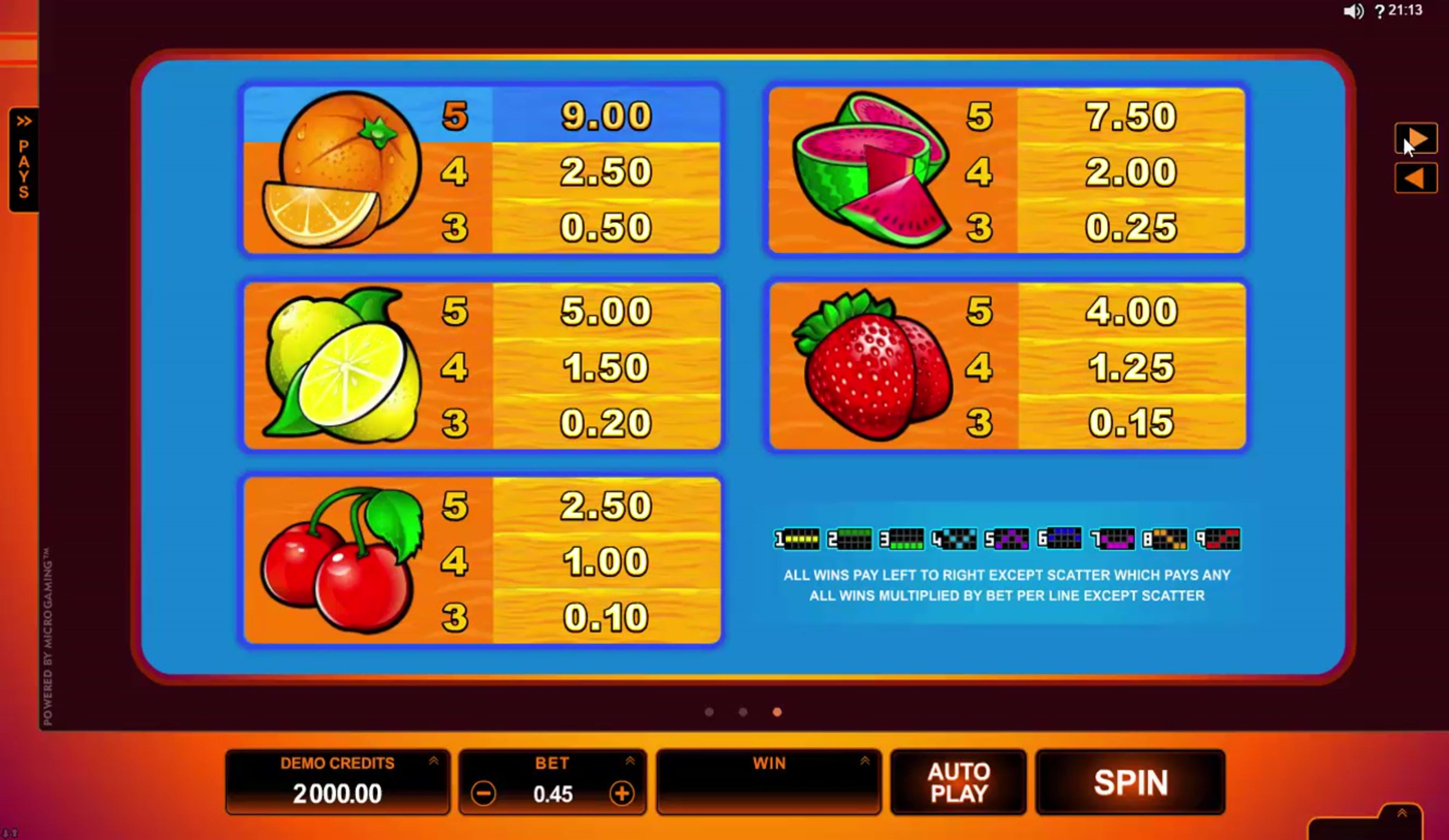 Spelet har färre rader än de flesta moderna spelautomater tenderar att erbjuda i dag. Du får högst nio av dem, med möjligheten att välja bara några av dem om du vill. Du får placera en satsning på 1 till 5 mynt för var och en av de aktiva linjerna, och du kommer att kunna välja en myntstorlek mellan $ 0,01 och $ 2. Du kan spendera högst $ 10 per rad och upp till $ 90 totalt. Minsta tillåtna insats är dock så låg som $ 0,01.